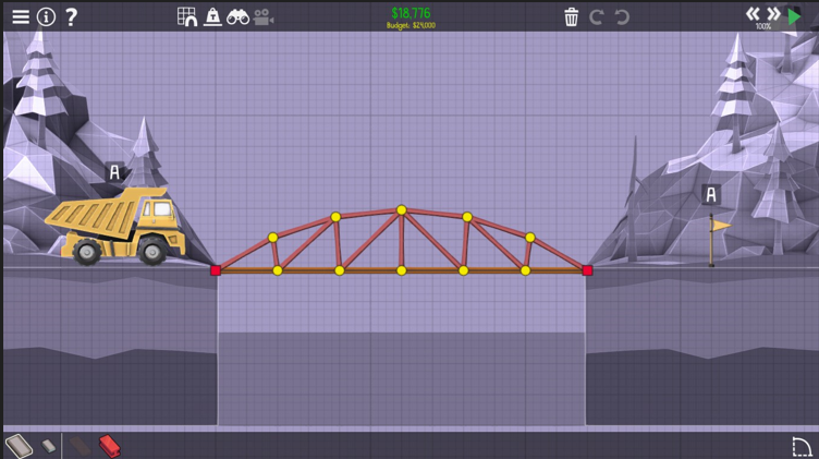 Step 6: Test your bridge by running the simulation. If vehicles fall or the bridge collapses, examine the red stress points to identify where it failed.